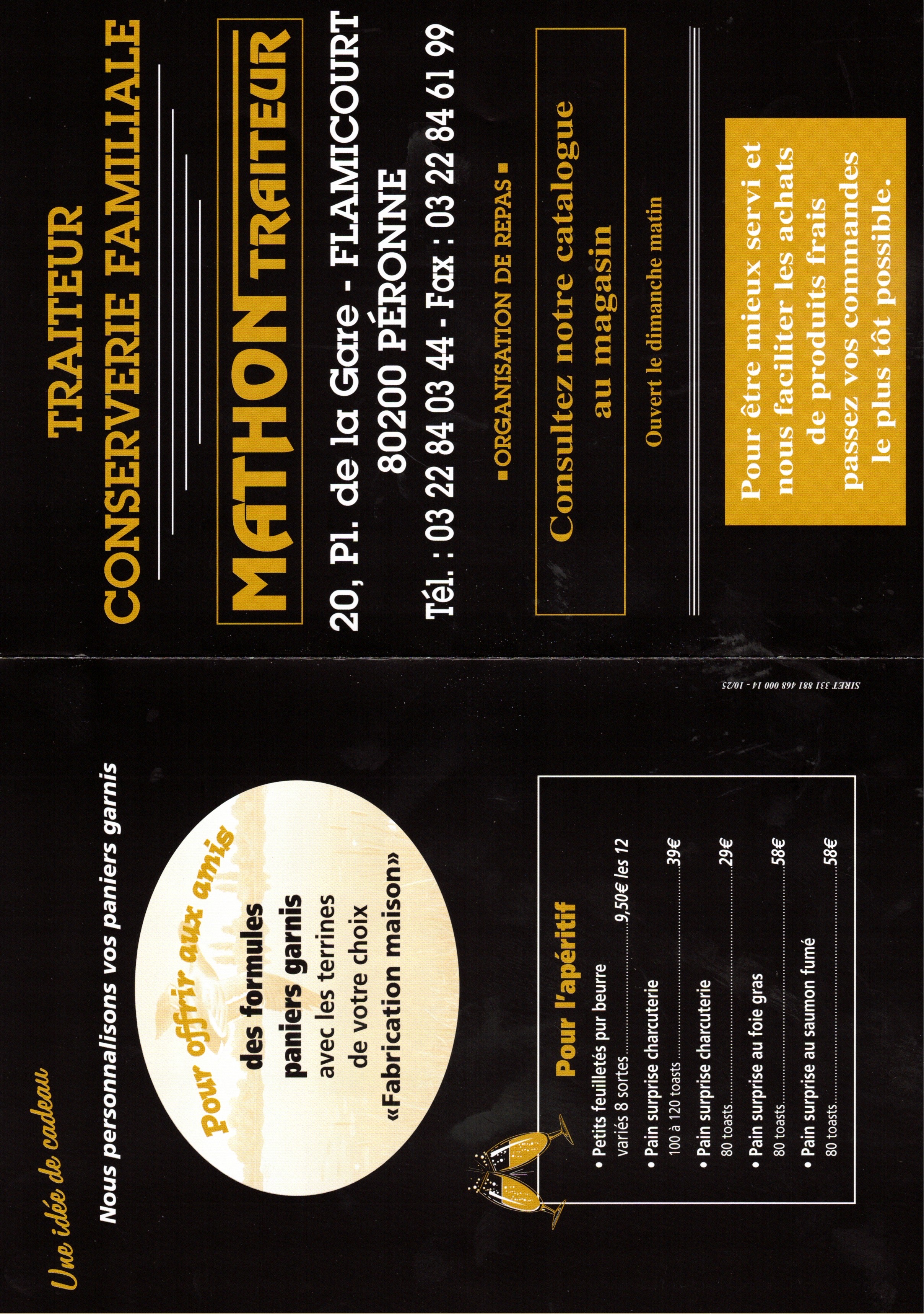 L'entreprise familiale Mathon Traiteur est installée à Doingt-Flamicourt depuis plus de 40 ans. Notre boucherie charcuterie traditionnelle met à votre disposition son savoir-faire artisanal. Situé dans l'ancienne gare de Péronne, votre traiteur vous propose le meilleur de la cuisine, comme de la viande de premier choix et réalise différents plats cuisinés, de la charcuterie et des conserves artisanales.